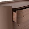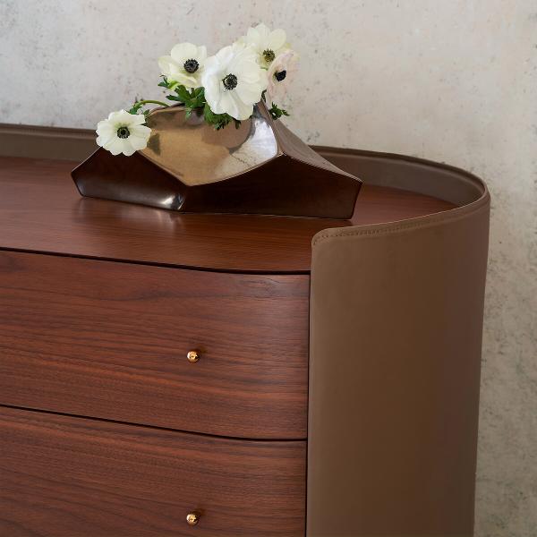 Dans un désir de sophistication, ses parois gainées de véritable cuir italien, offrent un contraste élégant avec le placage noyer des tiroirs.