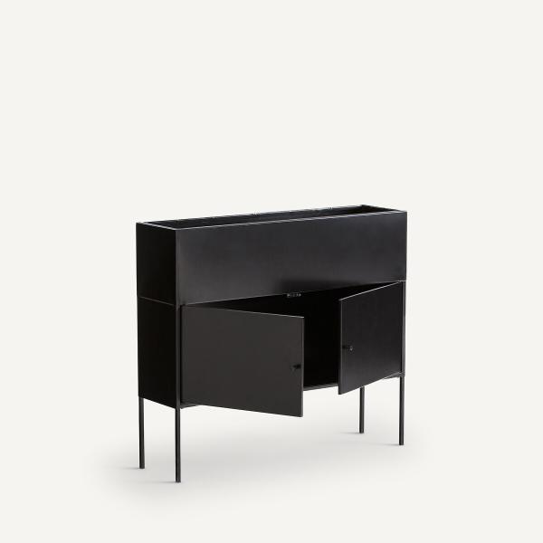 La console / planteur Consuela. Un style contemporain et épuré pour mettre en valeur vos plantes et avoir votre matériel de jardinage à portée de main et joliment dissimulé derrière les 2 portes.