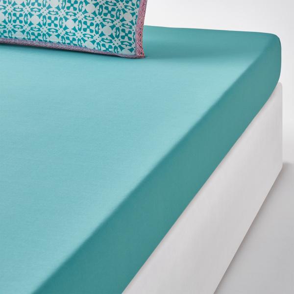 Drap-housse coton, Yucatan Imprimé blanc/turquoise 140x190 cm