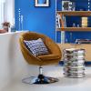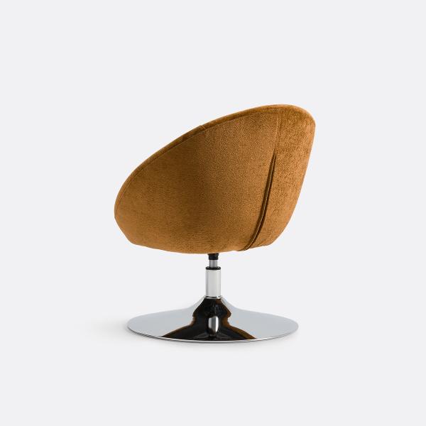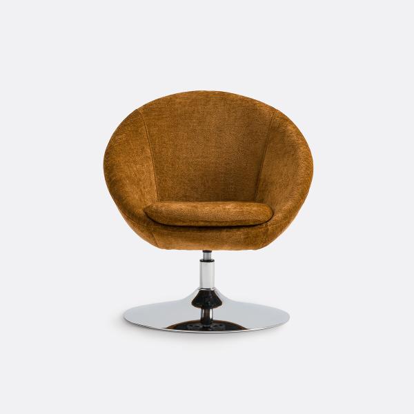 Ligne boule très 70's. Mix des matières, entre fer chromé et tissu en velours texturé. Le fauteuil rotatif Judie allie confort de qualité et esprit vintage.Description