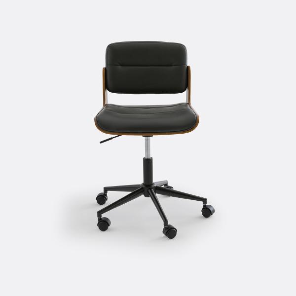 Le fauteuil de bureau Mikel allie simplicité, design vintage et fonctionnalité. Avec sa structure plaquée noyer et son revêtement en simili (polyuréthane),il présente une ligne épurée et graphique. Équipé de roulettes, il permet une grande liberté de mouvement.
