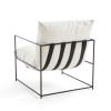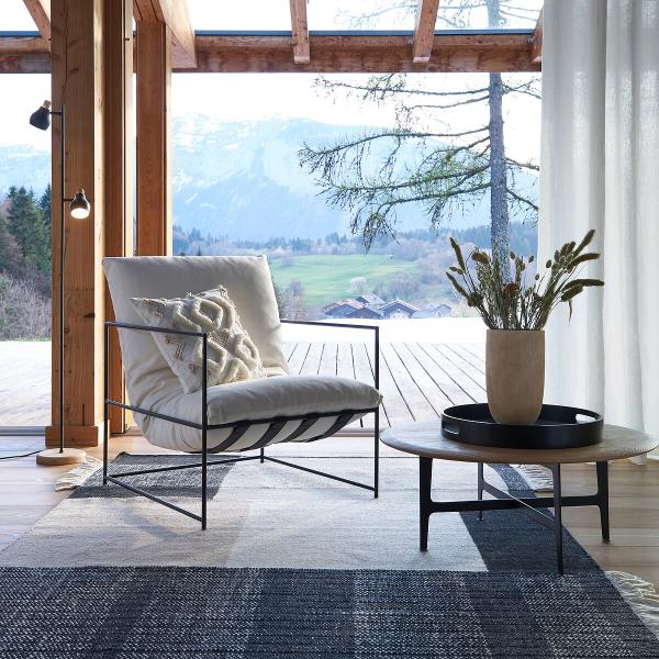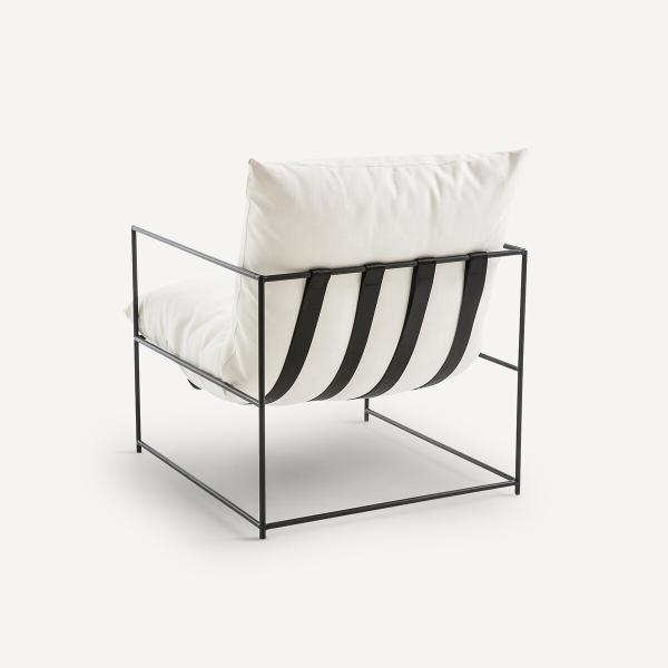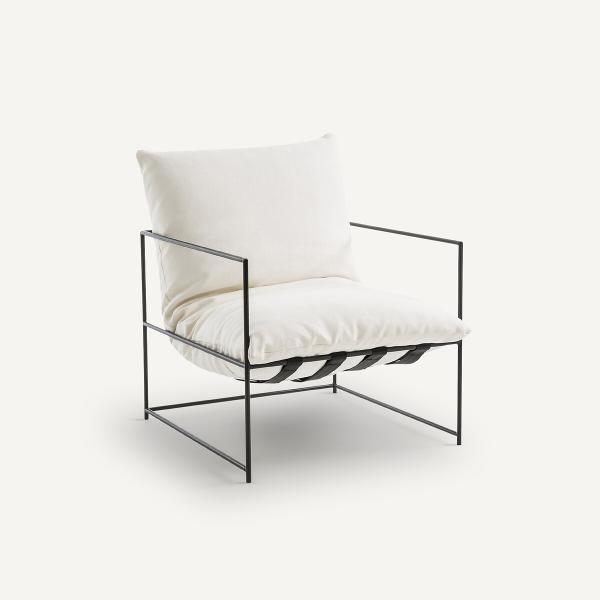 Le fauteuil Sgothan se caractérise par une élégance intemporelle, un design sobre et aérien. Sa fine structure en métal noir soutient avec légèreté un épais coussin blanc, chaleureux et confortable.