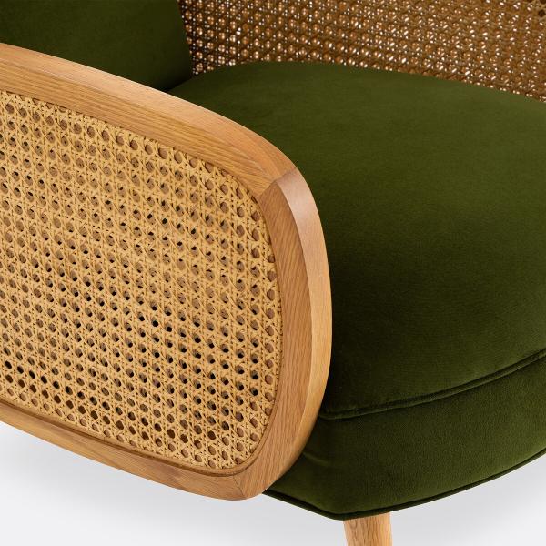Fauteuil velours et cannage, Buisseau Vert T. Unique