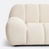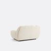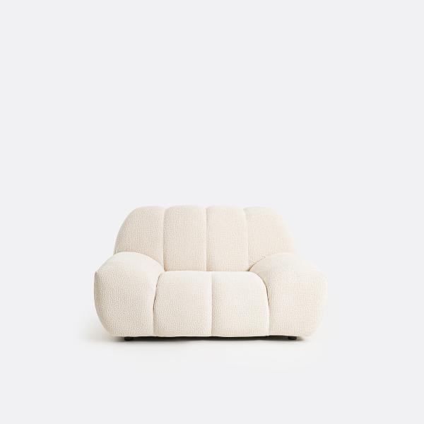 ""Le fauteuil Nuria s’inspire des codes emblématiques des années 70 avec son assise basse posée à même le sol et son allure généreusement moelleuse. Un jeu de coutures dessine une alternance de volumes rebondis et de courbes, évoquant un effet de boudins, qui rappelle l’esthétique enveloppante et le confort douillet des intérieurs seventies.""
