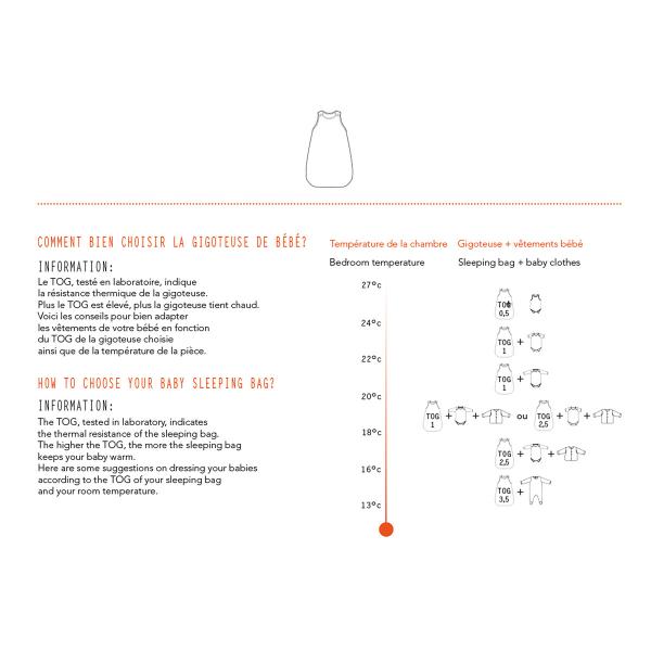 Nos gigoteuses sont donc aujourd’hui conçues pour répondre à cette nouvelle norme, c’est pourquoi vous pourrez constater que les largeurs d’encolures sont désormais plus petites et que l’épaisseur du rembourrage est également moins importante. • Le TOG testé en laboratoire et noté de 1 à 10 indique la résistance thermique de la gigoteuse. Plus le TOG est élevé, plus la gigoteuse tient chaud.