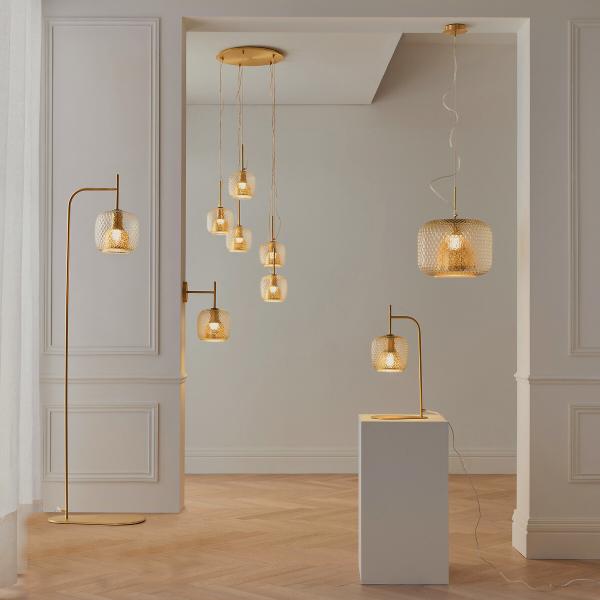 L?association du laiton brossé au verre ciselé s?inspire de la mouvance Arts Déco où l?élégance de la ligne soulignait la noblesse des matériaux. Le diffuseur en métal perforé conjugué au globe en verre produisent une lumière aux notes douces et diffuses. Une suspension iconique et essentielle ancrée dans l?ADN de la marque.