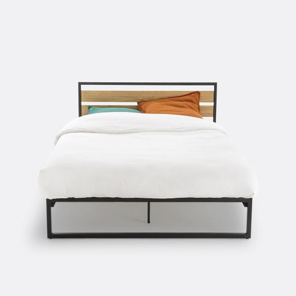 Dans un esprit industriel, le lit Hiba vous séduira par ses lignes sobres, sa tête de lit pin en massif et sa structure en acier laqué noir mat.