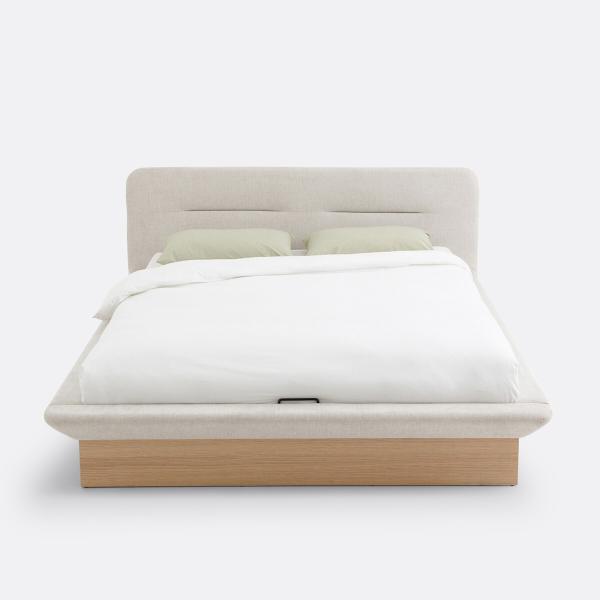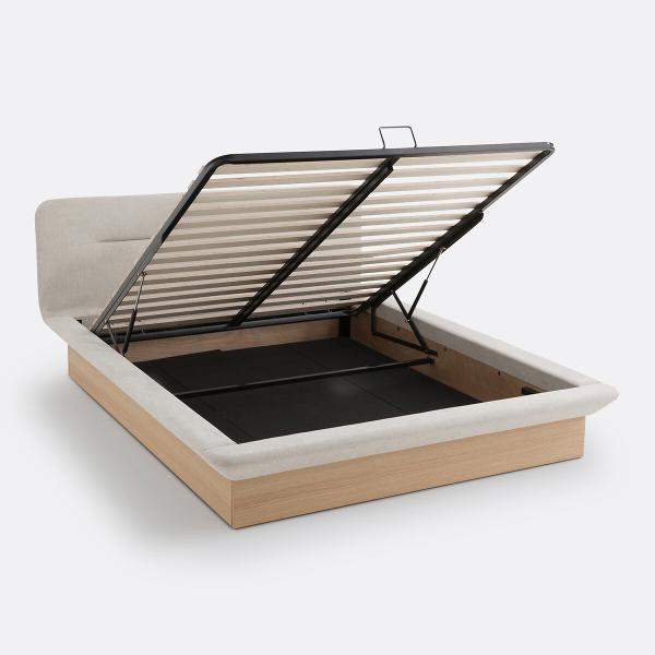 Le lit coffre avec sommier relevable TIVARA. Fonctionnel, élégant et contemporain, le lit TIVARA intègre sous son sommier relevable un espace de rangement très pratique pour y caser oreillers, couverture, linge de lit.Description