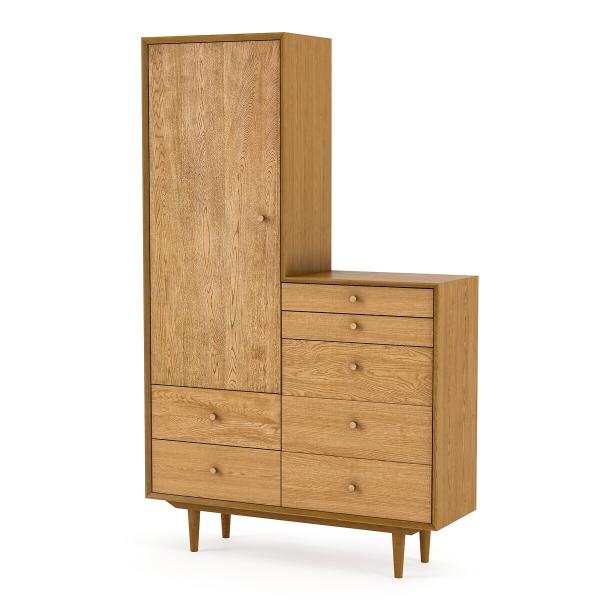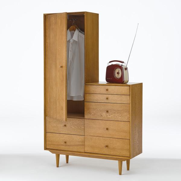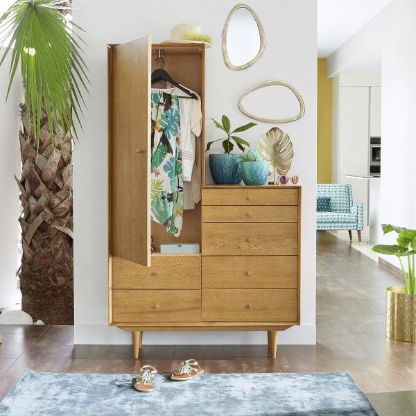 Le meuble d?entrée Quilda. Lignes esprit Sixties, sobriété du design et forme originale : ce meuble d?entrée, pratique avec sa partie penderie et sa partie chiffonnier, apportera sa touche vintage à votre intérieur.