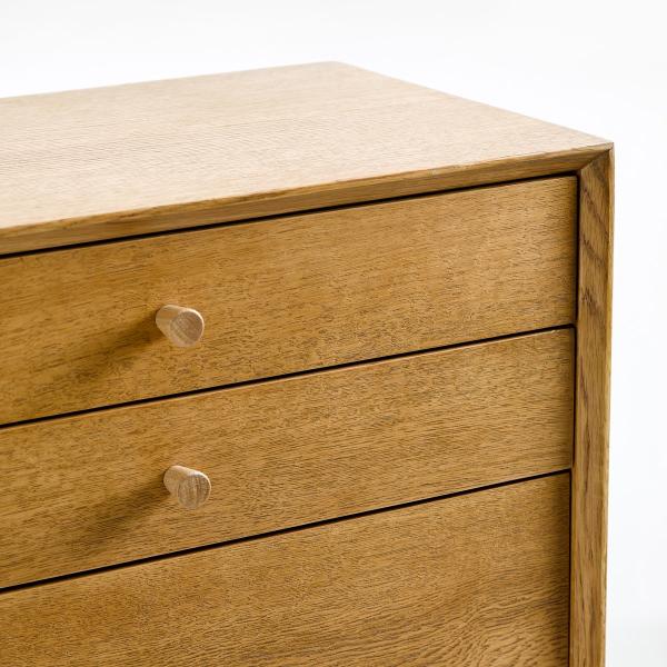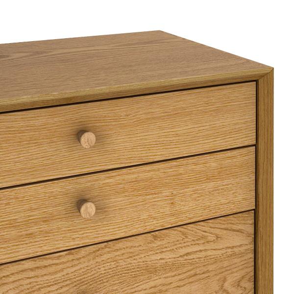 - Structure en MDF et paulownia plaqué chêne, finition vernis nitrocellulosique.