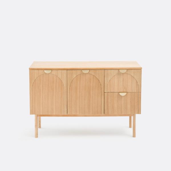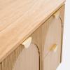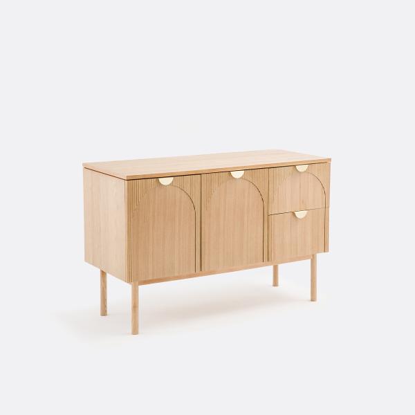 Bois rainuré. Façades dessinées en arche. Poignées raffinées coloris laiton. Le meuble sous vasque Gisela s'inspire de la tendance Art déco, pour une élégance toute contemporaine dans votre salle de bain.Description