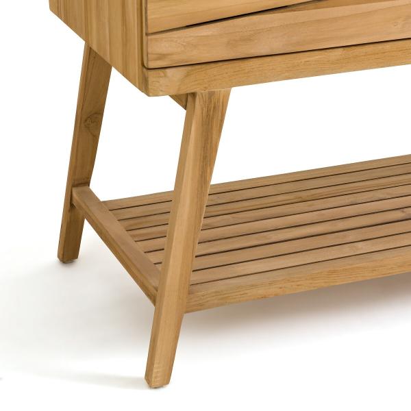 Pièce phare de votre salle de bain, le meuble Kito en teck massif certifié FSC® est idéal pour recevoir 2 vasques à poser. Il offre différents espaces de rangement dont 2 niches avec porte et une niche centrale ouverte.Son étagère pourra également accueillir de nombreux paniers.