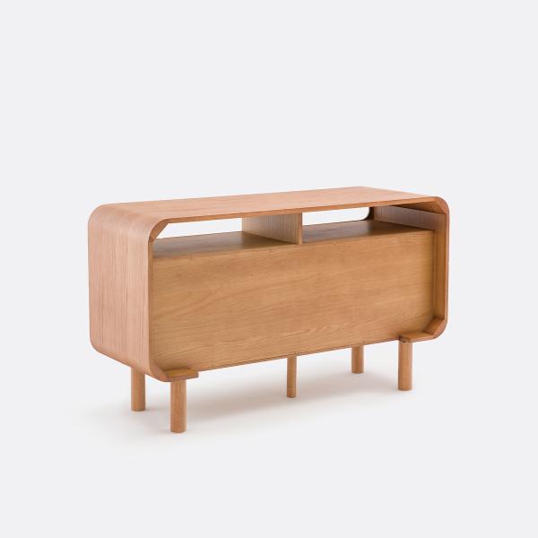 - Structure en MDF plaqué chêne teinté foncé, finition vernis polyuréthane