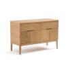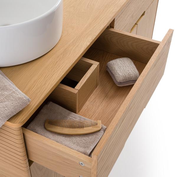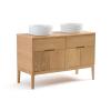Lignes contemporaines et épurées. Structure en chêne et plaqué chêne certifiés FSC®. Conçu pour accueillir 2 vasques à poser, le meuble de salle de bain Sarena se compose de 2 tiroirs et de 4 portes avec niches fermées.Toujours à portée de main, serviettes éponge et accessoires de beauté trouveront facilement leur place.
