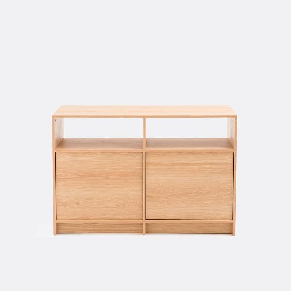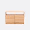 - Caisson et étagères en MDF plaqué chêne, finition vernis polyuréthane