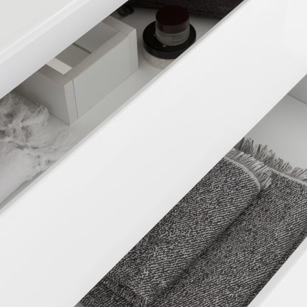 - Façades des tiroirs en MDF laqué blanc, finition glossy polyuréthane