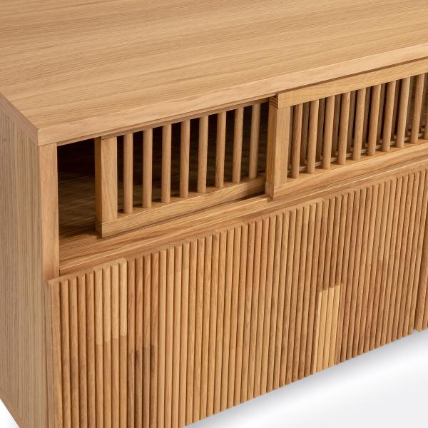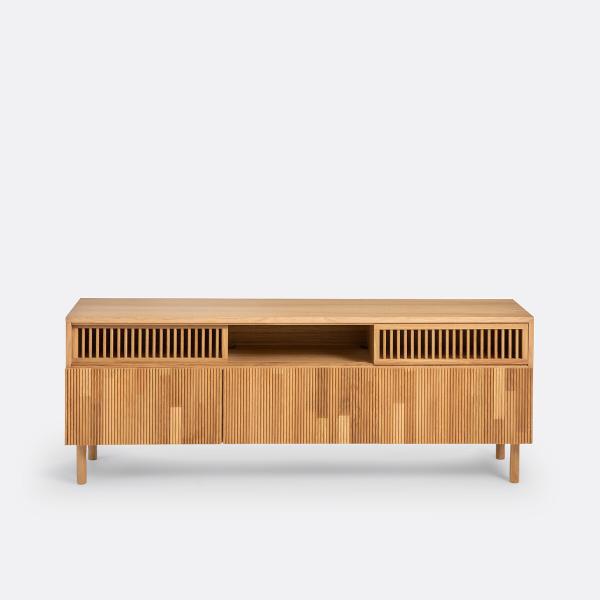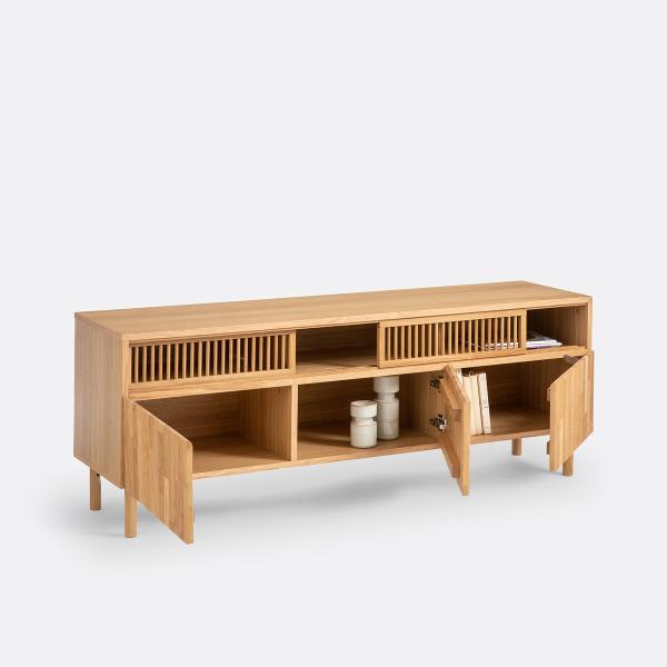 Bienvenue dans votre coin détente. Lignes graphiques et façades en chêne massif pour ce meuble TV Bilbao de style contemporain. Très fonctionnel, il se caractérise par ses nombreux rangements pour accueillir le matériel TV/Hifi en toute discrétion.