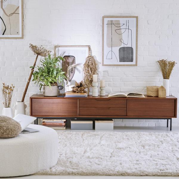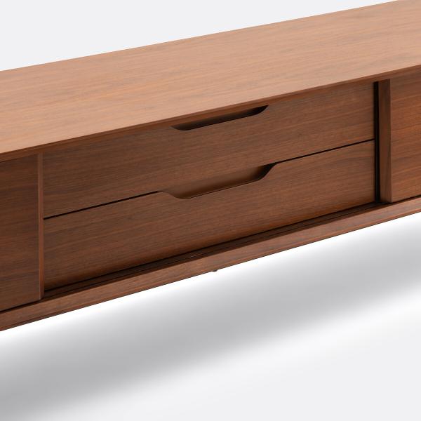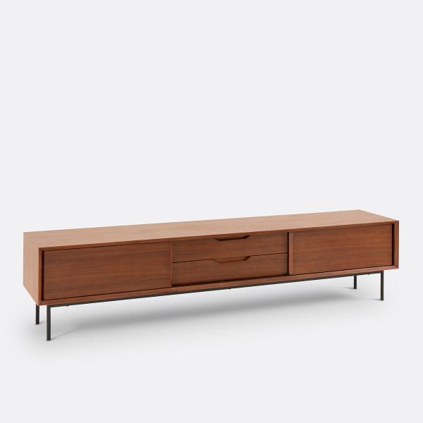 Entente parfaite du design et de la fonctionnalité. L?alliance du bois foncé et du métal s?adaptera à tous les styles d?intérieurs. Pratique : ses portes coulissantes et ses tiroirs permettent d?y ranger magazines, télécommandes...
