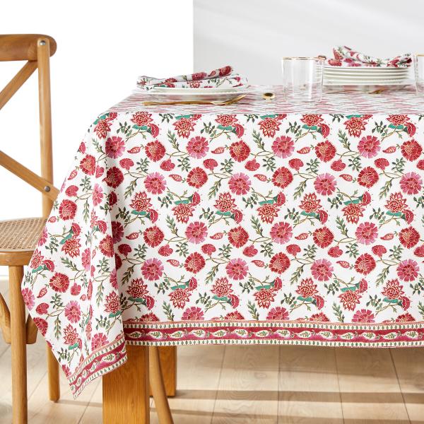 Nappe imprimée coton lavé, Bhojan Blanc/rouge 150x300 cm
