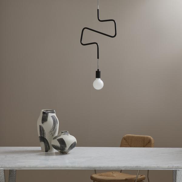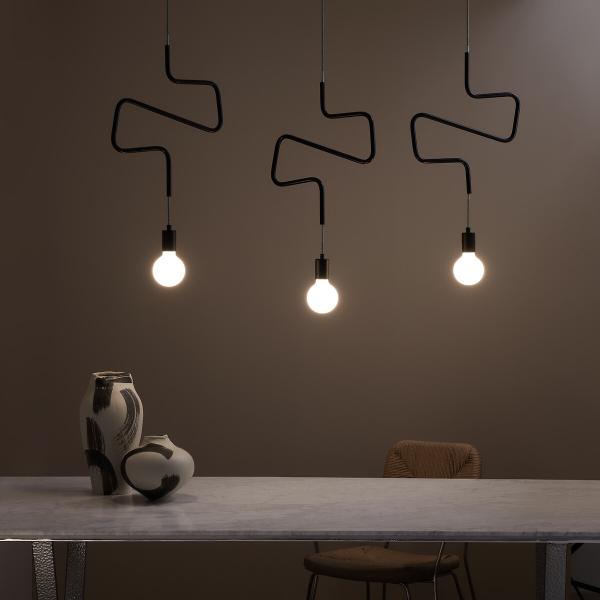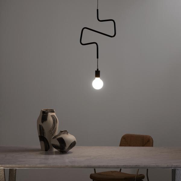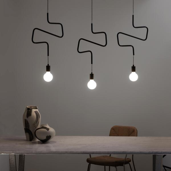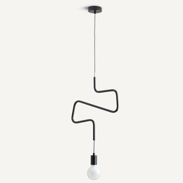 Une suspension graphique, comme un trait de crayon flottant dans l'air du temps. Composée d’un câble en tissu noir et blanc qui serpente avec légèreté à travers un tube métallique courbé, elle apporte une touche contemporaine et raffinée.Qu’elle soit installée seule, en duo ou en groupe, elle transforme l’éclairage en un jeu de lignes et de lumière.