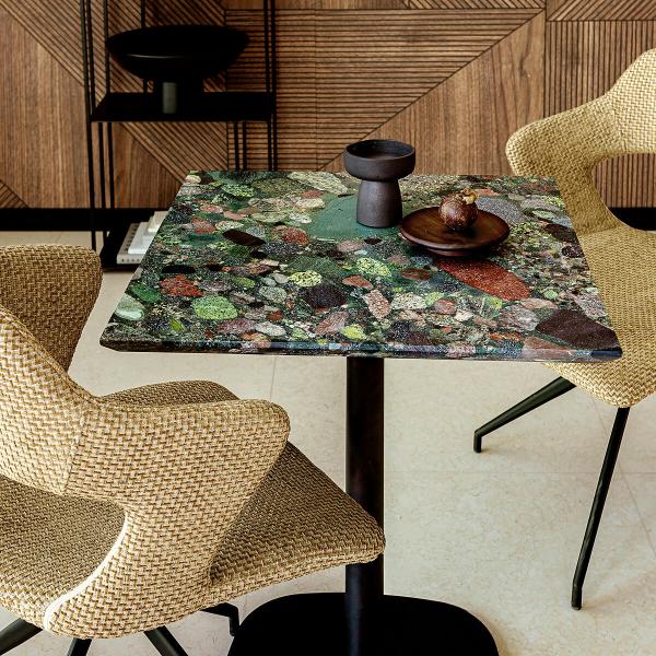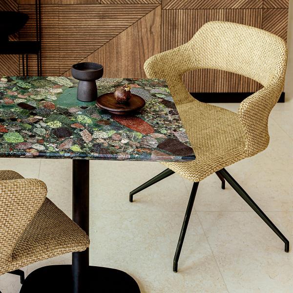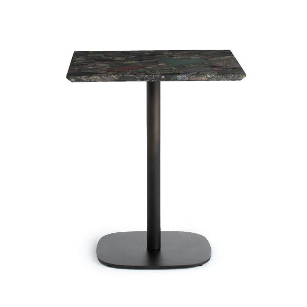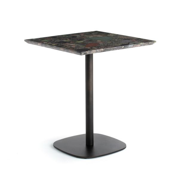 La table carrée Beldixe. Avec ses lignes simples et soignées, la table de dimensions bistrot Beldixe nous accueille avec un plateau aux motifs tachistes abstraits.
