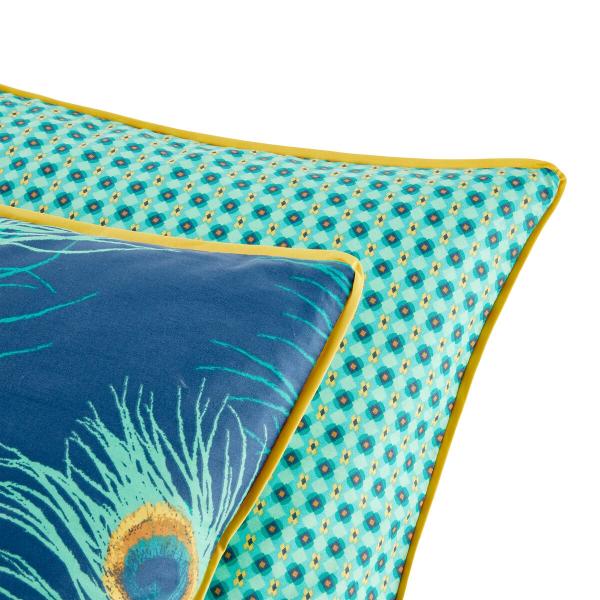 La taie d'oreiller en percale de coton SHAKHRA. Élégance et légèreté des plumes de paons, richesse des tons et contrastes des motifs, la taie d'oreiller SHAKHRA saura séduire les amateurs de belles matières.