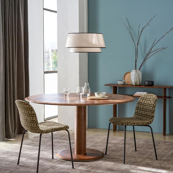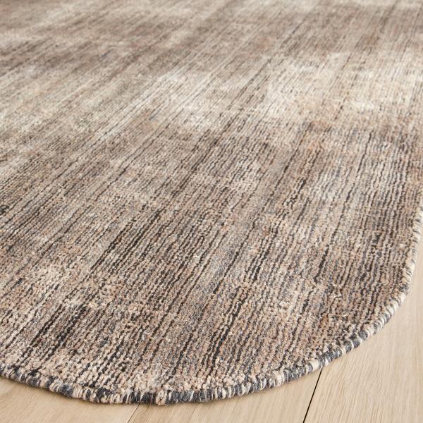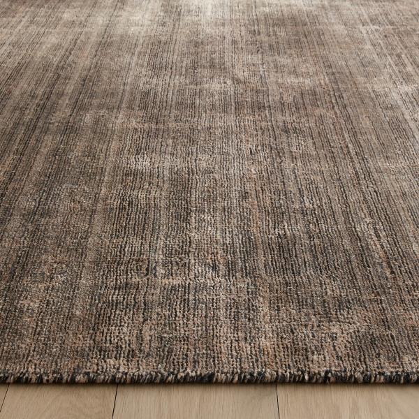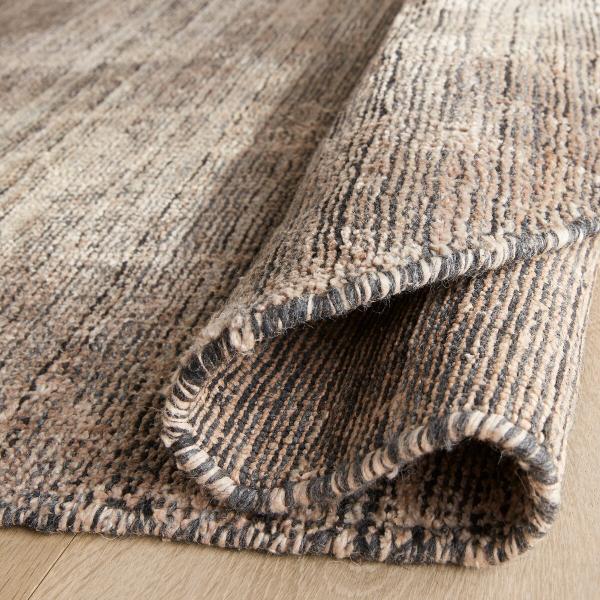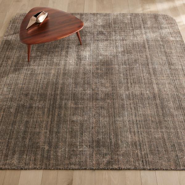 De fines rayures vibrantes dans des tons beige, mordoré et noir donnent au tapis Elona un effet subtil de faux uni. Le mélange des matières lui apporte un côté lumineux facile à associer.De format carré à coins arrondis, son design est organique et ses dimensions généreuses.