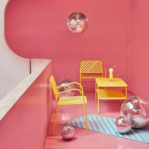 Envie d'une pure beach party sous le soleil d'ocean drive ? Inspirée du mobilier des motels de Miami - surnommée Magic City - la collection Hellø Blogzine Outdoor joue sur les codes d'une déco rétro-eighties pop au colorama acidulé.Des franges, des rayures, des formes asymétriques et graphiques, cette collection se veut exubérante, libre et fun : ambiance cocktail au bord de la piscine garantie.